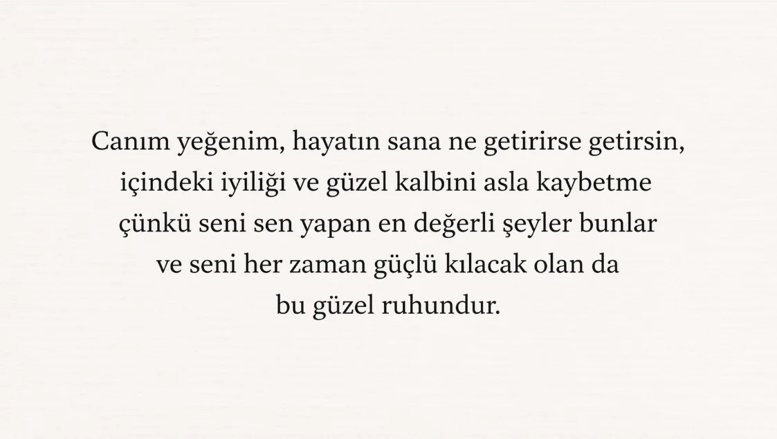 1. Canım yeğenim, hayatın sana ne getirirse getirsin, içindeki iyiliği ve güzel kalbini asla kaybetme çünkü seni sen yapan en değerli şeyler bunlar ve seni her zaman güçlü kılacak olan da bu güzel ruhundur.